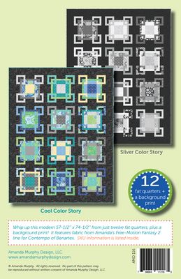 A simple block quilt with a modern esthetic! Whip up this modern 57.5in x 74.5in from just twelve fat quarters, plus a background print! It features fabric from Amanda’s Free-Motion Fantasy 2 line for Contempo of Benartex. This entire design is made from squares and rectangles so it is simple to piece!