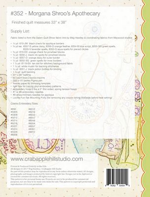 Maybe you’ve met Morgana! Have you ever visited her Apothecary shop in Hocuspocusville? She stocks all of the beauty necessities for the modern witch. I SWEAR by her Instant Mole Hairs! This 33 x38 in quilt features two panels of crayon tinted embroidery, and one of applique. After all that’s done, it goes together in a snap..like magic!